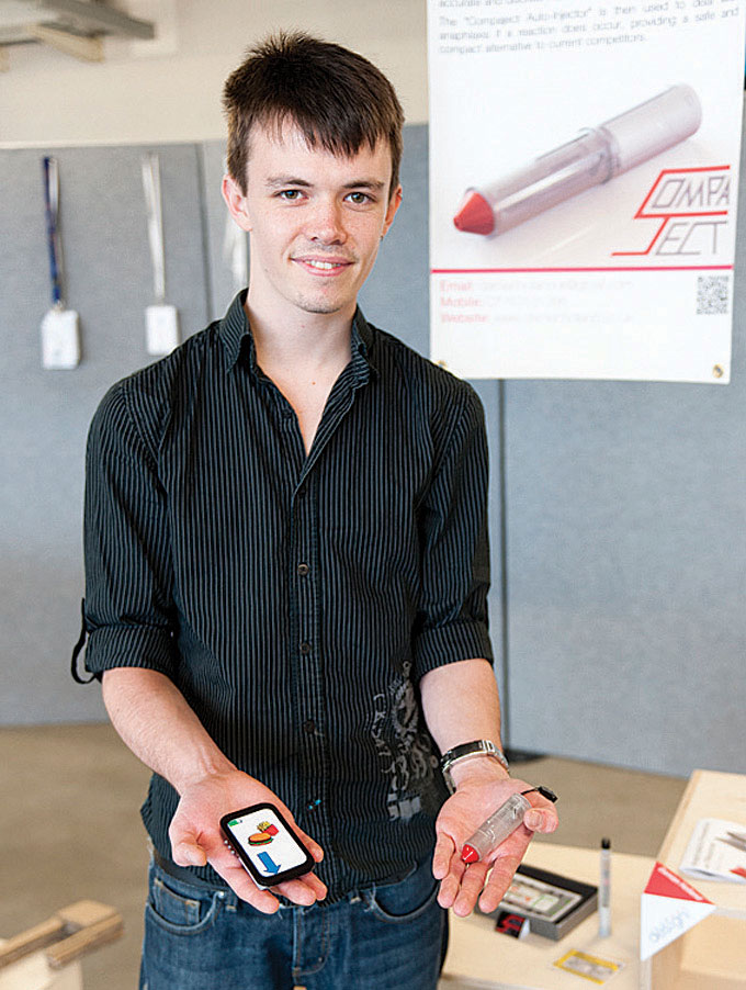 - Allergen biosensor and adrenaline autoinjector: the biosensor detects tiny amounts of allergens in food, while the adrenaline auto-injector offers an improved design to ensure swift treatment, shown above, left. The near-fatal allergic reaction to nuts of Damian Holland’s girlfriend led to his lifesaving design.