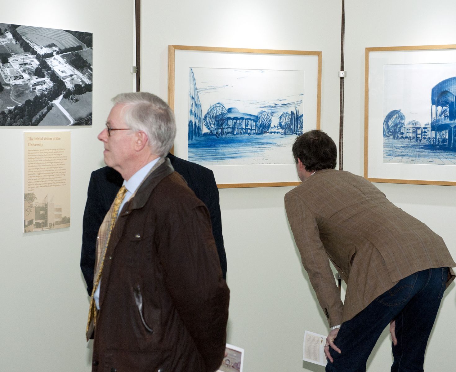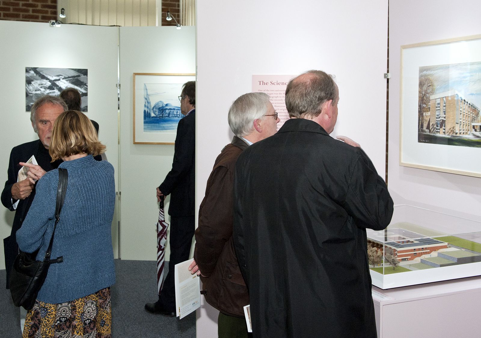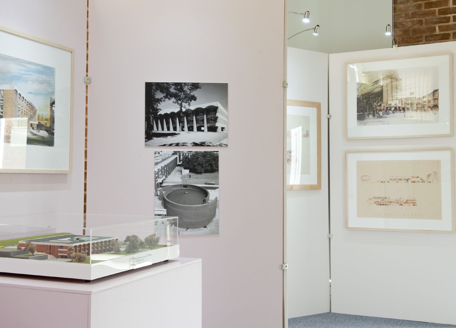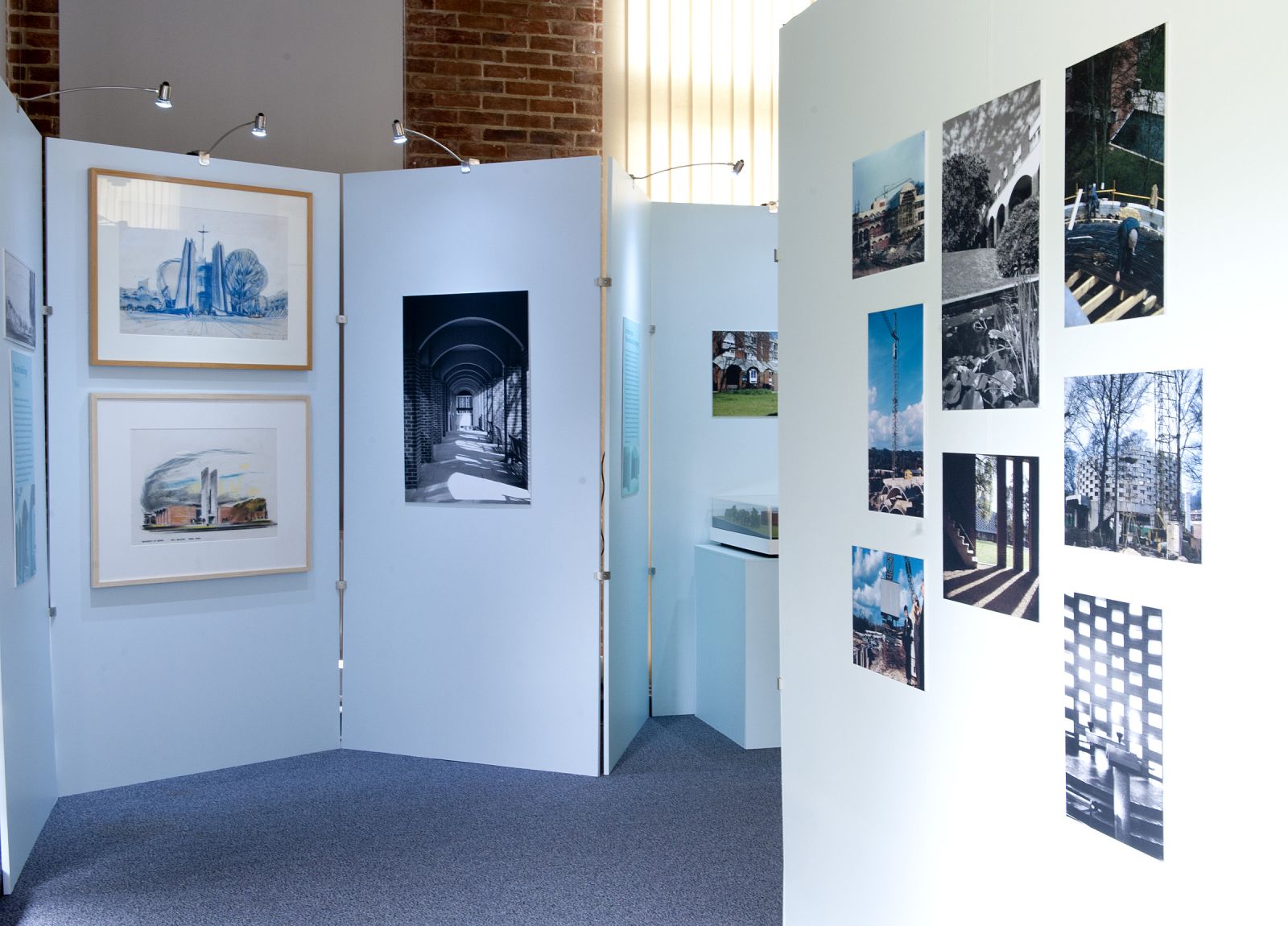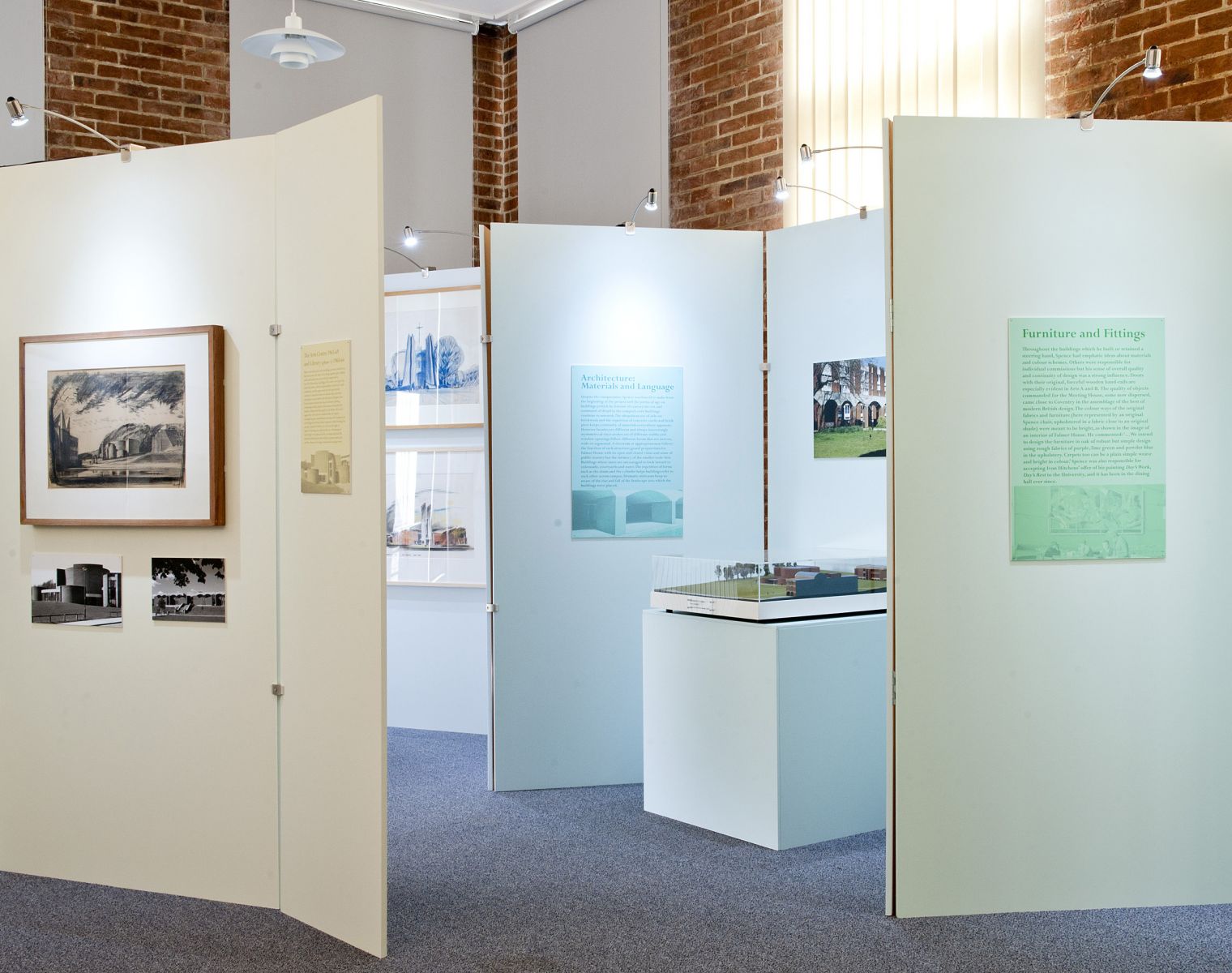 The exhibition space, a room in Arts A that overlooks the main square and core campus buildings, took advantage of a view of campus from the window which brings the final results of the first phase of building into sharp focus. The exhibition explored the phases of development, public and press reaction to the scheme, the early use of the buildings and the landscaping of the environs, as well as the buildings’ place in Spence’s distinguished career. Professor Howard was assisted by former Sussex Art History students.