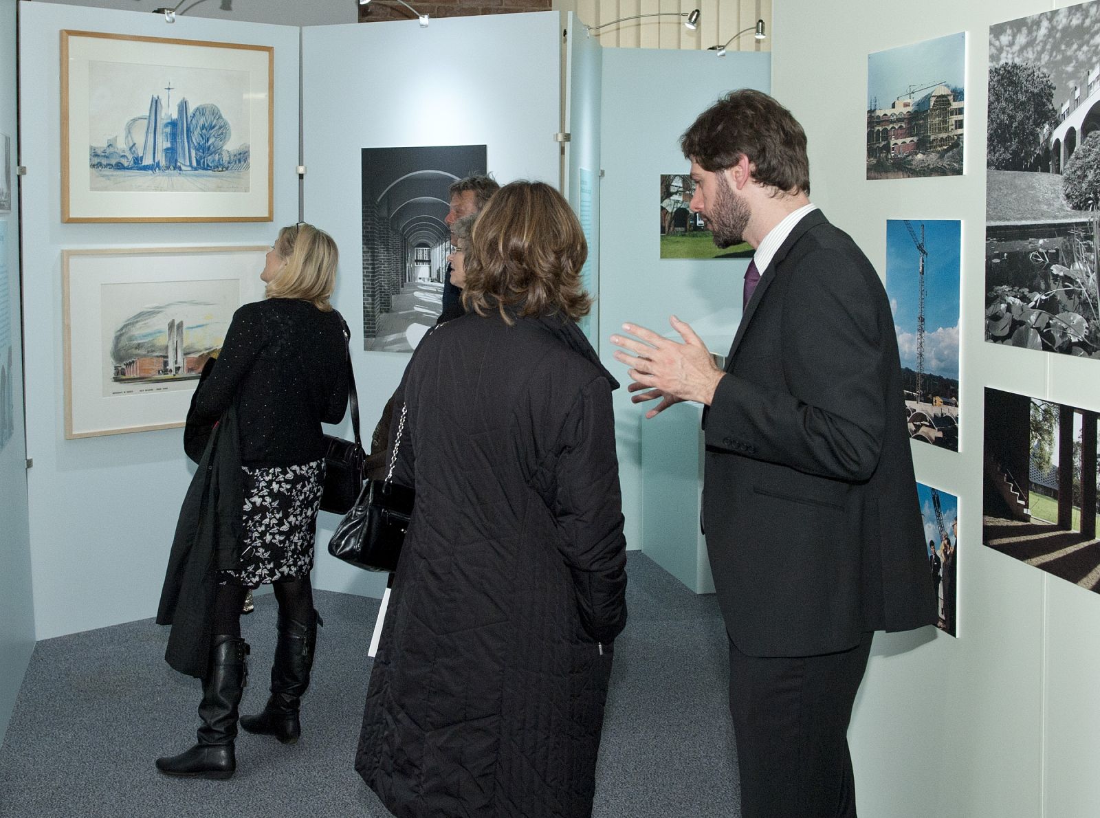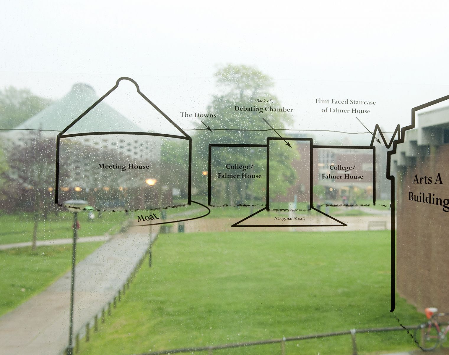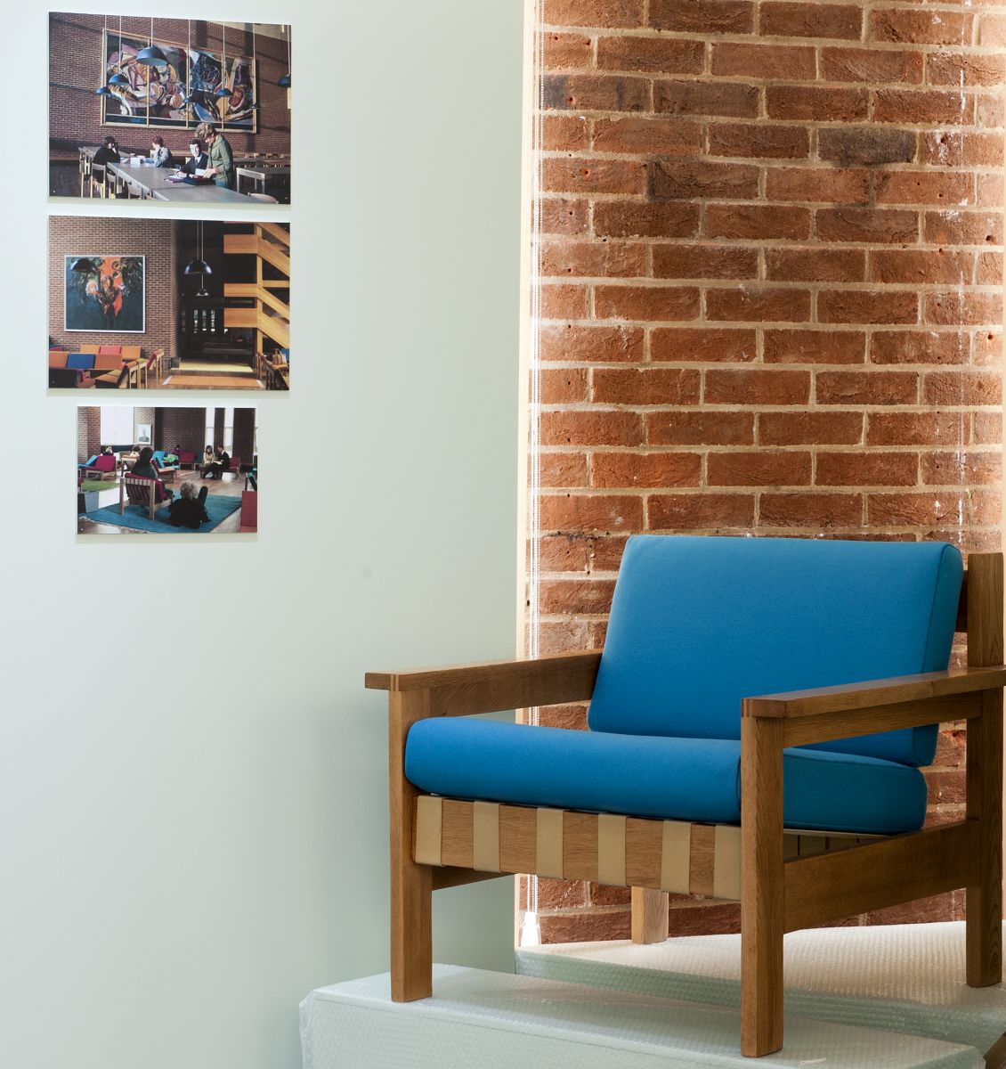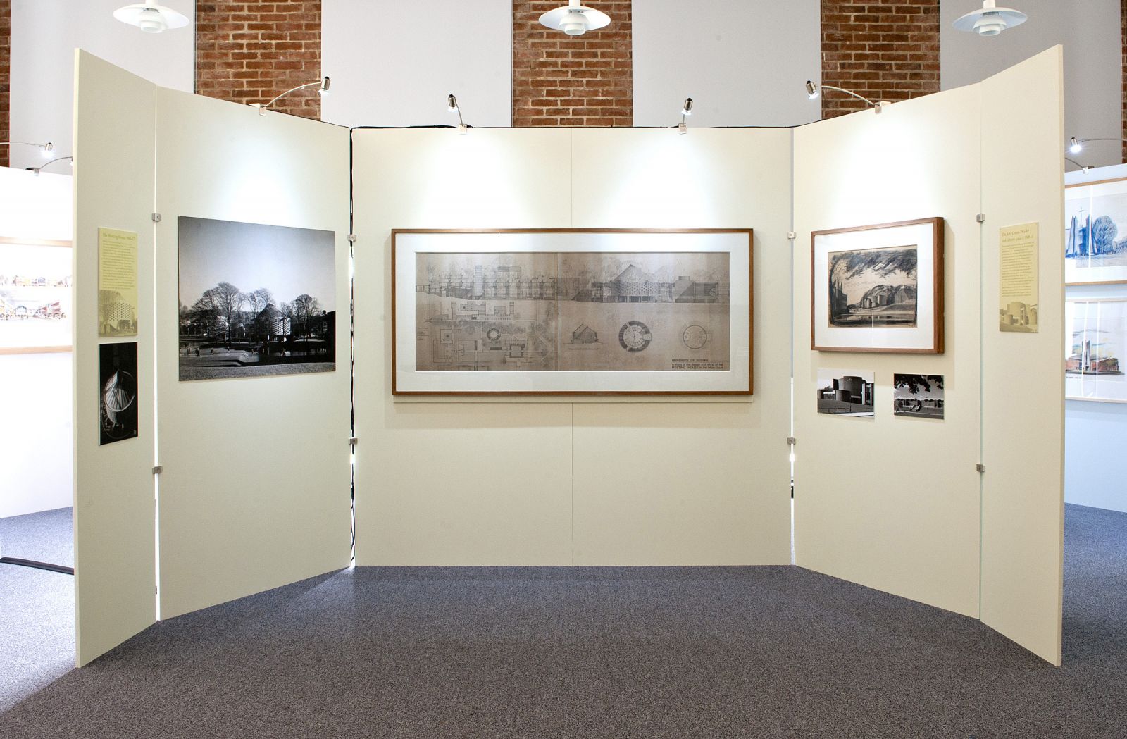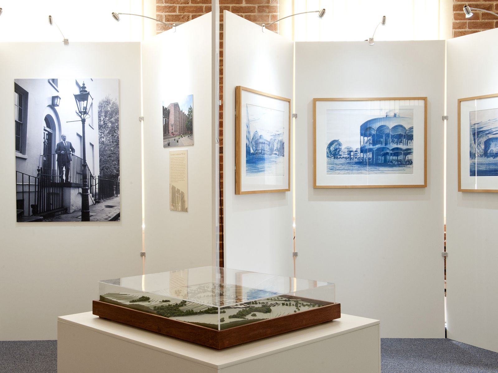 The exhibition space, a room in Arts A that overlooks the main square and core campus buildings, took advantage of a view of campus from the window which brings the final results of the first phase of building into sharp focus. The exhibition explored the phases of development, public and press reaction to the scheme, the early use of the buildings and the landscaping of the environs, as well as the buildings’ place in Spence’s distinguished career. Professor Howard was assisted by former Sussex Art History students.