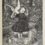 The first eight images in this section (see gallery above) draw attention to the interest in animal pictures notable in the Alice books and throughout print culture at this time. The series of images of girls and giant birds (nos. 2–6) include images from Alice, as well as from a new English translation of stories by Hans Christian Andersen (no. 5). There is an uncanny wood engraving from the magazine Good Words (no. 2), in which a girl and gull have a peculiar, symbiotic connection, and the girl stares at us with the bird’s alien gaze. Good Words was a magazine known for high quality illustrations. Curiously, some of these images anticipate a recent lithograph of a girl with a gigantic bird, Paula Rego’s Loving Bewick (2001), the title of which is a tribute to the history of wood engraving.