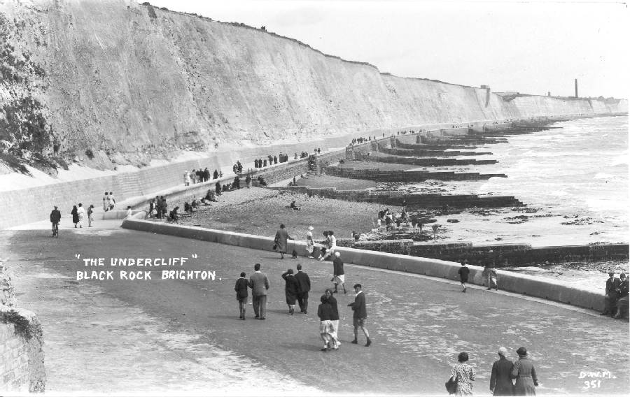 Continuing erosion of the sea cliffs east of Black Rock caused increasing concern in the years following the First World War. In 1930 Brighton Corporation began building a massive sea wall at the base of the cliffs all the way to Rottingdean. An undercliff walkway or promenade was constructed on top. Unemployed Welsh miners were lowered on ropes over the cliffs to trim the faces back to a supposedly safe angle of 75 degrees. The sea wall was completed and the walkway opened in 1933. An extension to Saltdean followed in 1935. |