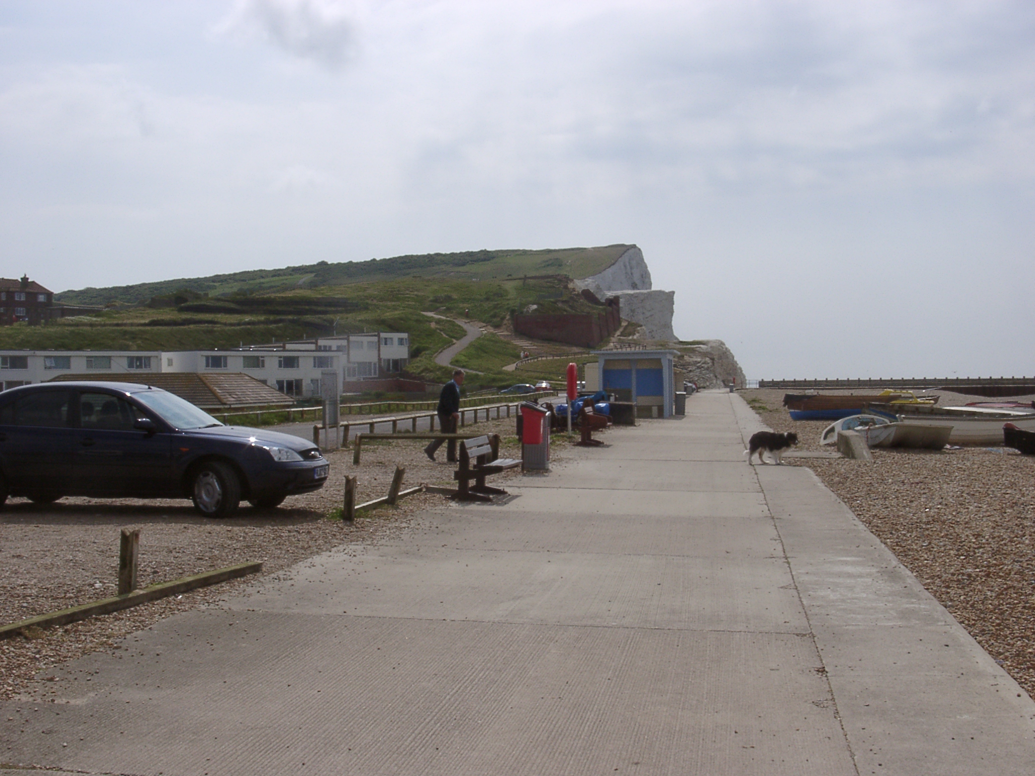 | A major beach recharge project was completed in 1987, using shingle dredged from the seabed off the Isle of Wight. In this 2002 photograph the recharged beach looks even healthier than its predecessor in 1910. Apart from a terminal groyne at Splash Point (foreground) there are no groynes to check longshore drift. Shingle accumulates quite rapidly at the Splash Point groyne, and each year has to be taken back in lorries to replenish the beach at the western end of Seaford. |