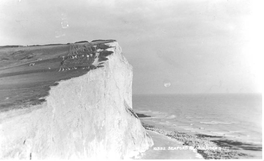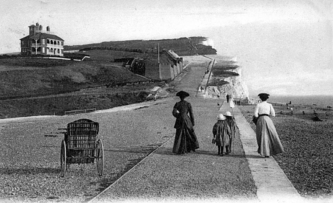 | Seaford Beach from the East Cliff in about 1910. The large numbers of wooden groynes have restricted longshore drift. The beach is quite wide and in the foreground the storm berm is a considerable distance from the promenade. On the right hand side, north of the promenade, shingle has been extracted, presumably for building purposes, leaving the town more vulnerable to inundation from the sea. |