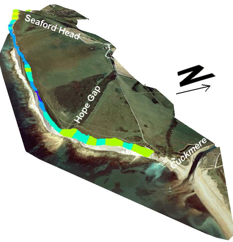 3-D view of cliff retreat between 1874 to 1999 along the cliffs between Seaford and Cuckmere Haven