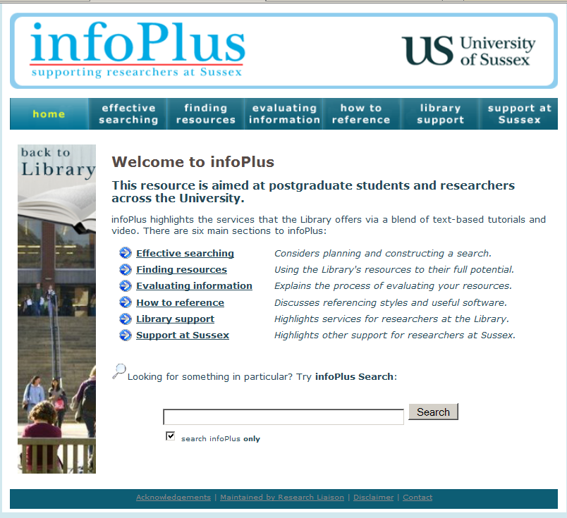 Supported by Researcher Development funding, infoPlus was developed in liaison with doctoral students and in consultation with the Department of Informatics and the Teaching and Learning Development Unit.