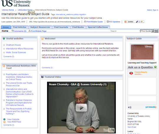 The guides also form a point of contact with the Learning and Teaching Support team, as we have an instant chat box on the front page, via Meebo, for answering Library queries.