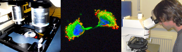 Our fluorescence microscopes are state-of-the-art systems for the study of the biochemical structure and the molecular interactions that are critical in living cells. We can look deep into tissues using confocal or 2-photon microscopy to watch multiple, colour-coded molecules live in 3D. We provide software and training that permits measurement and analysis of the distribution and mobility of structures in the images of live tissues. Of course the relationship between light and the biological specimen is not simple; we offer training and consultation to help you understand how the image represents the biological reality and how you can get the most back from the effort you invest into the microscope.