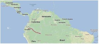 Map showing route for Mika Peck's paddle board expedition down the Amazon River in July 2013