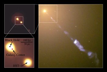Above: Hubble Space Telescope Images of M87. At right, a large scale image taken with the Wide-Field/Planetary Camera-2 from 1998 (NASA and the Hubble Heritage Team (STScI/AURA), J. A. Biretta, W. B. Sparks, F. D. Macchetto, E. S. Perlman). The two images at left show an image taken in 2006 with the Advanced Camera for Surveys' High Resolution Channel. The position of the supermassive black hole is indicated by the black dot in the lower left panel, and a knot in the jet (HST-1), which was flaring in 2006, is also indicated on this panel. The red dot indicates the center of the galaxy's light distribution, which is offset from the position of the black hole by 22 +/- 3 light years.