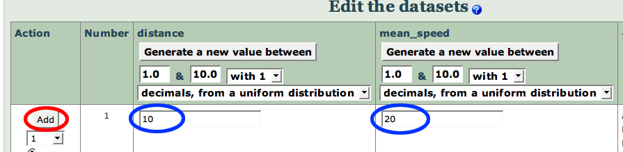 The following page allows you to create the datasets that will be used to replace the wildcards 'distance' and 'mean_speed' when the question is presented to students. You can add values manually, or allow study direct to generate sets of values automatically. When the question is presented to students, Study Direct will choose one set of values
