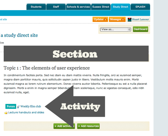 In Study Direct you can add activities for Students to engage in to any section of your site.
