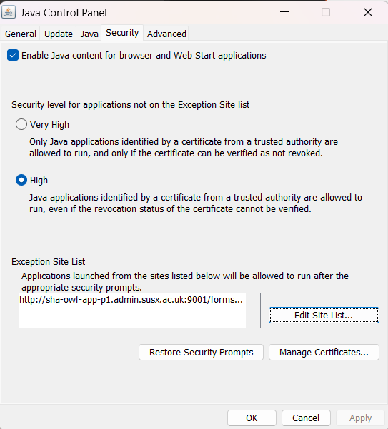 6. Copy and paste this URL http://sha-owf-app-p1.admin.susx.ac.uk:9001/forms/frmservlet into the ‘Exception Site List’ box.